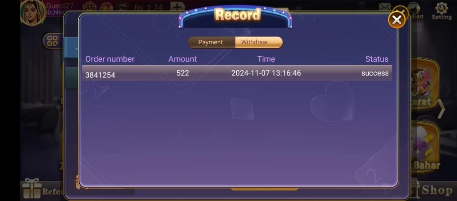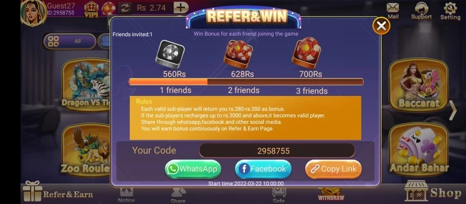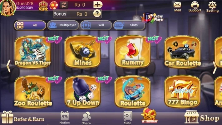 With 23+ games, including Ludo, Mines, Tiger Dragon, Rummy, Andar Bahar, and many more card games, the app offers a rich gaming experience. You can choose to play any of these games to start earning.